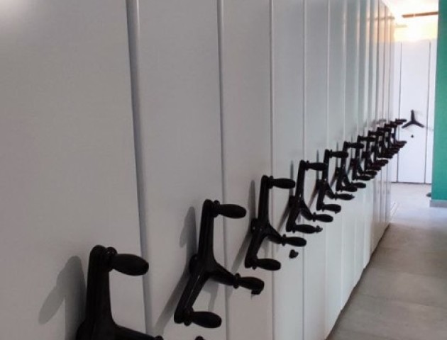 Из-за значительной высоты стеллажей – 2040 мм и при малой ширине секций были установлены специальные антиопрокидыватели, обеспечивающие устойчивость и безопасность персонала при выдвижении секций.