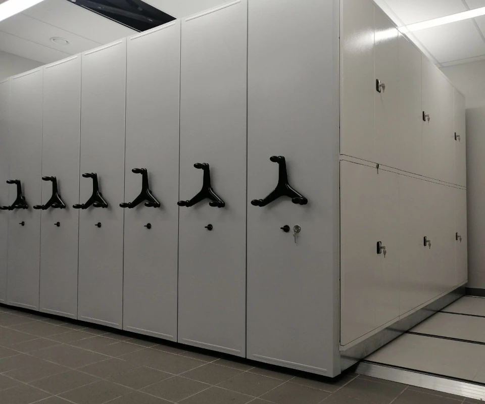 Двери на закрывающихся стеллажах не только ограничивают доступ к хранимым документам и товарам, но и защищают от пыли и света.