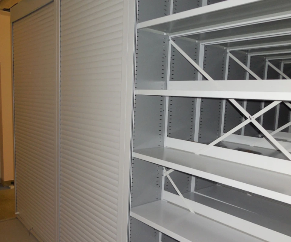 Жалюзи имеют центральный замок в нижней части. Они не занимают место в рабочем проходе между мобильными стеллажами.