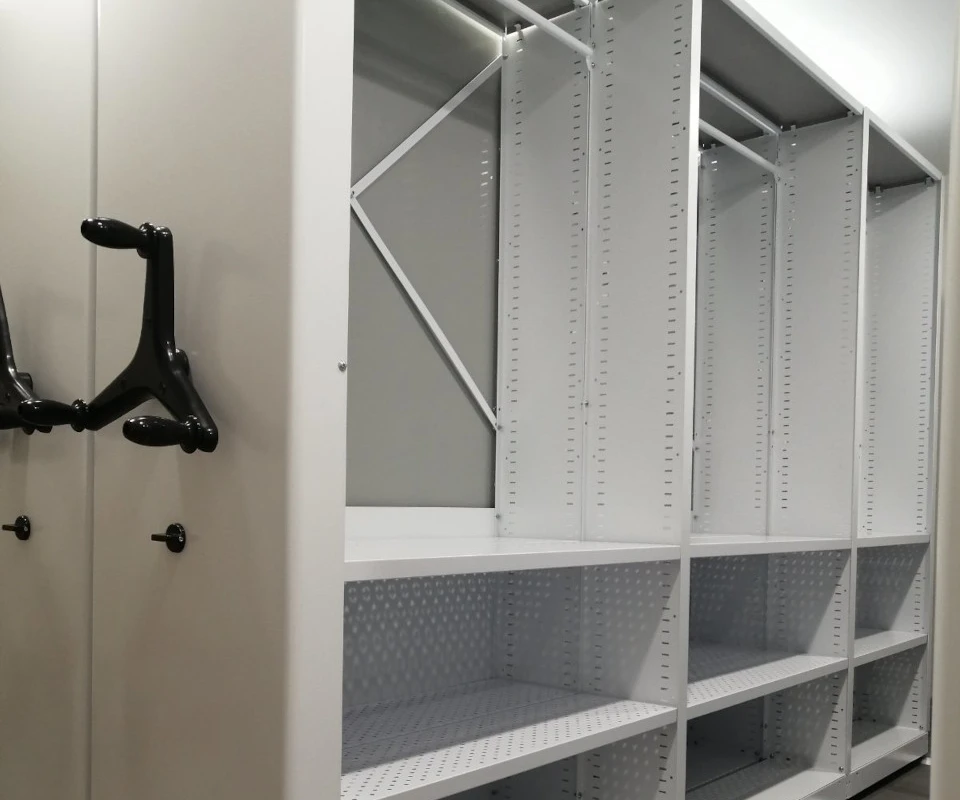 Перфорированные полки используются в стеллажах для хранения одежды, тканей, обуви в музеях, на складе.