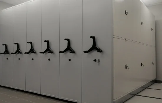 Производим несколько вариантов закрывающихся металлических стеллажей с дверями для обеспечения сохранности и ограничения доступа к архиву секретной документации. Для ограничения доступа к секретным документам или музейным коллекциям достаточно закрыть дверями крайний мобильный стеллаж и установить на него замок. Замок блокирует возможность движения. Такая конструкция позволяет недорого решить проблему сохранности.