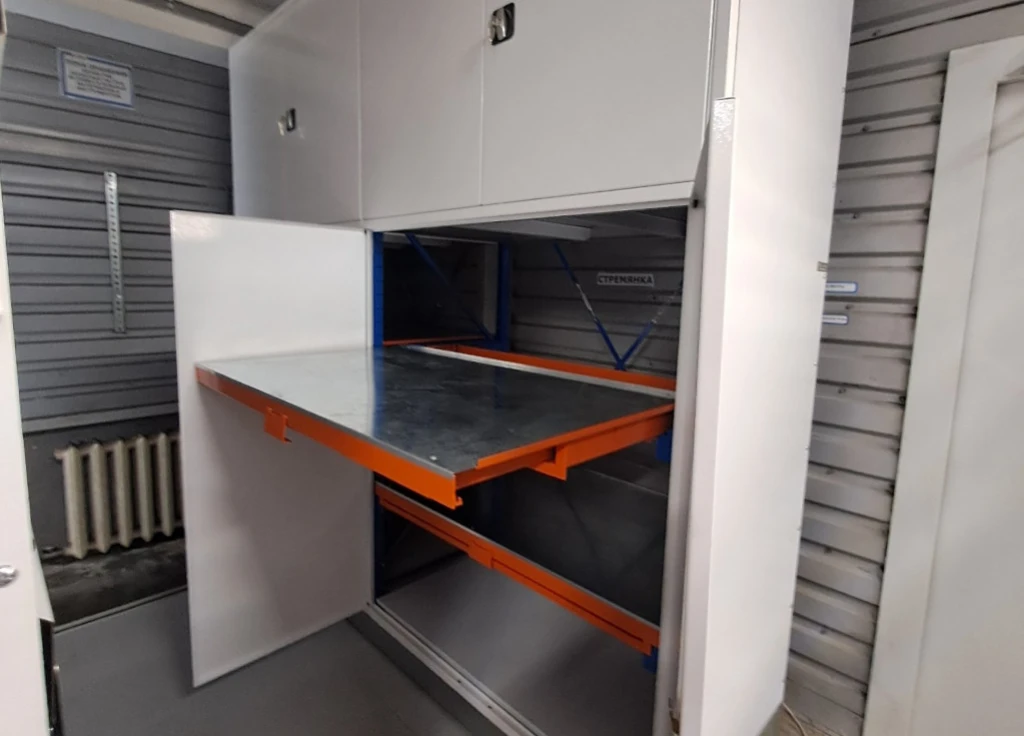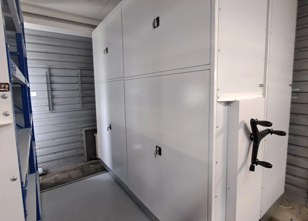Среднегрузовые передвижные стеллажи закрывающиеся дверями жалюзи для склада и других по назначению помещений.
