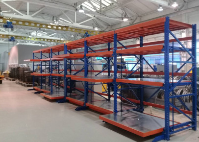 При наличии потолочной кран-балки, тельфера закладка и выгрузка оснастки на выкатные платформы стеллажа осуществляется с их помощью. Центральный рабочий проход перед линейкой стеллажей может быть существенно уменьшен, если для перевозки штампов Вы используете малогабаритные тележки, тележки типа Rocla с гидравликой для работы с поддонами и прочие маневренные механизмы. Кроме удобства и безопасности хранения тяжелого и ценного груза Вы получаете существенную экономию рабочей площади. При наличие потолочной кран-балки для размещения грузов используются как выдвижные платформы, так и верхние стационарные полки.