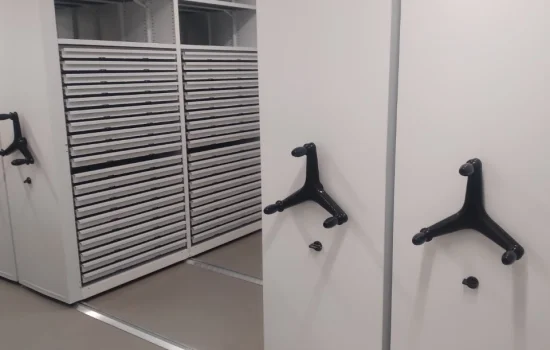 Мобильные стеллажи с электроприводом серии «Актив» оборудованы ящиками для хранения папок с кальками и чертежами. Автоматизированная система управления помогает легко находить документы.