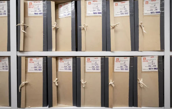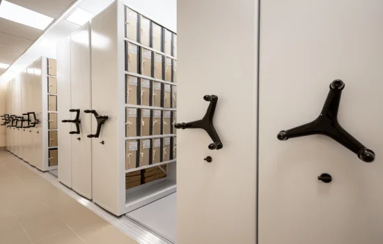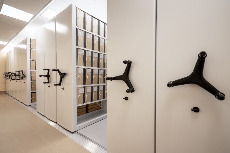 Архивные короба с документами размещаются на полках специальных стеллажей, изготовленных под размеры этих коробов. Габариты полок и расстояние между ними оптимальны, чтобы обеспечить необходимые промежутки между коробами. Это позволяет максимально эффективно использовать рабочие площади в архивном помещении.
